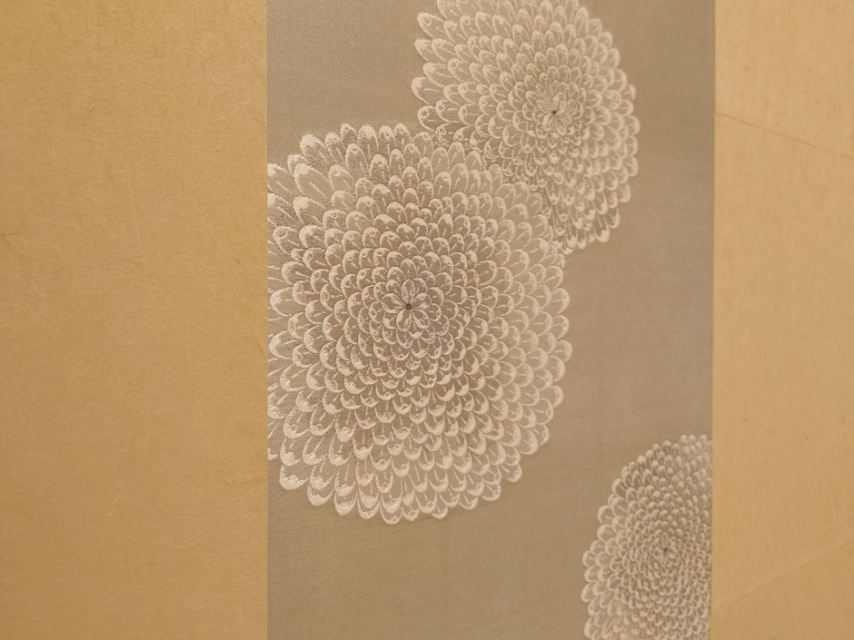今回は、280年を超える歴史を誇る京都の帯匠「誉田屋」の十代目当主・山口源兵衛により、プラチナの糸で織られた八重菊の文様が入った作品が新たに設置されました。制作にあたっては「菊は湯の友」という発想を起点とし、湯の香りに菊花を添える趣向にまかせて伊藤若冲の「菊花流水図」にインスピレーションを得た作品となっています。