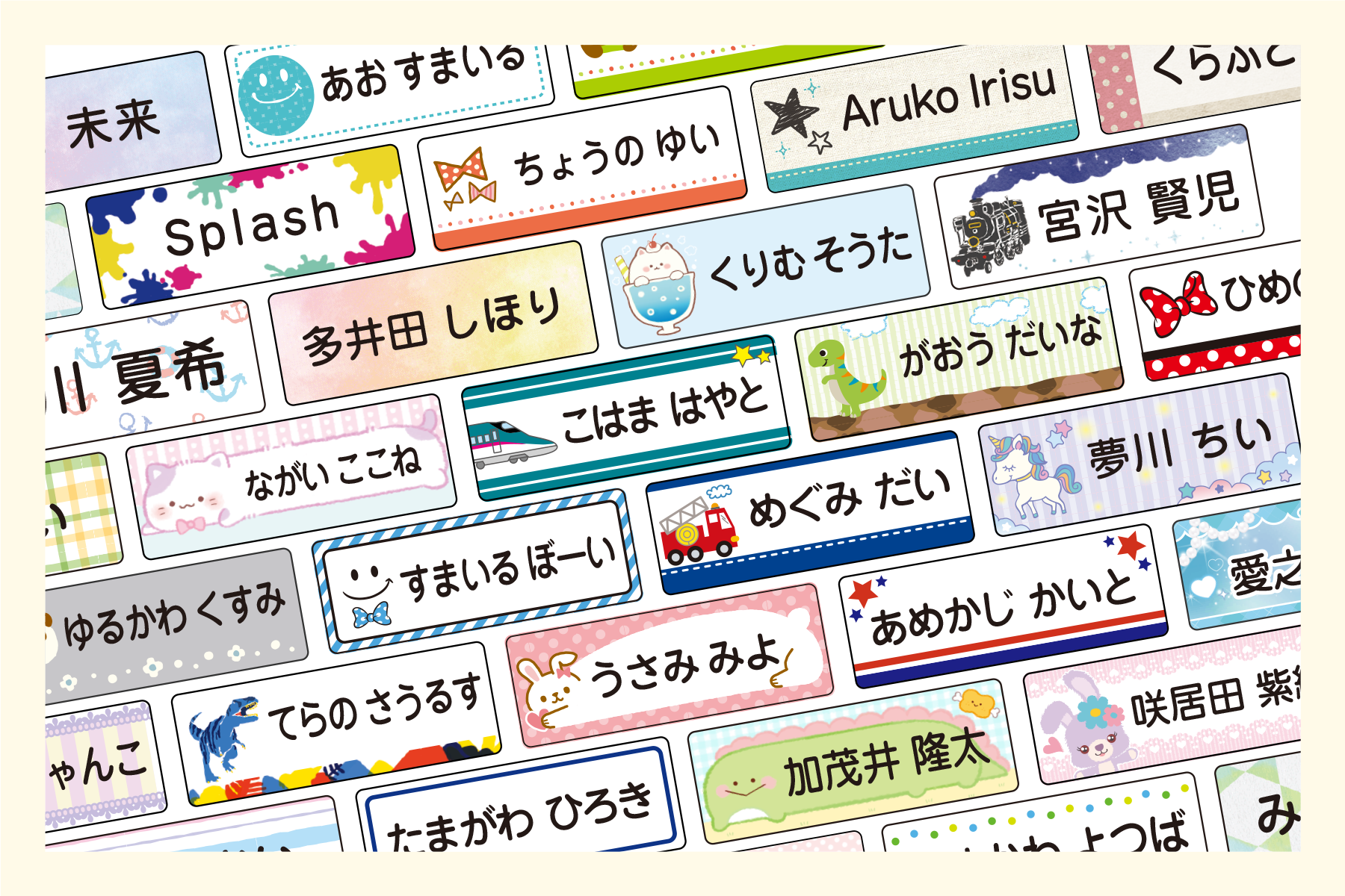 デザインは、すべてシールDEネームオリジナル。イラスト入りの個性的なデザインから、小学生でも使いやすいシンプルなデザインも多数、取り揃えています。