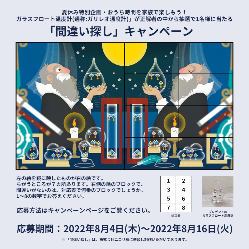 インテリア雑貨用品の販売を手掛ける茶谷産業株式会社(本社:大阪市淀川区、代表取締役社長:朴木 剛、以下 茶谷産業)の、公式オンラインストア「Chatani interior store」(チャタニインテリアストア)&男の書斎ブランド「Studiolo」(ストゥディオーロ)において、2022年8月4日(木)から、『夏休み特別企画・おうち時間を家族で楽しもう!ガラスフロート温度計(通称:ガリレオ温度計)が正解者の中から抽選で1名様に当たる「間違い探し」キャンペーン』を開催いたします。