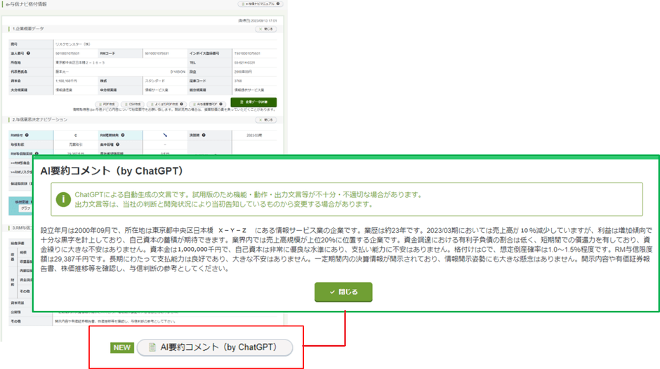 e-与信ナビの画面上にある「AI要約コメント(by ChatGPT)」をクリックすると、対象企業の情報を要約したコメントが表示されます。
