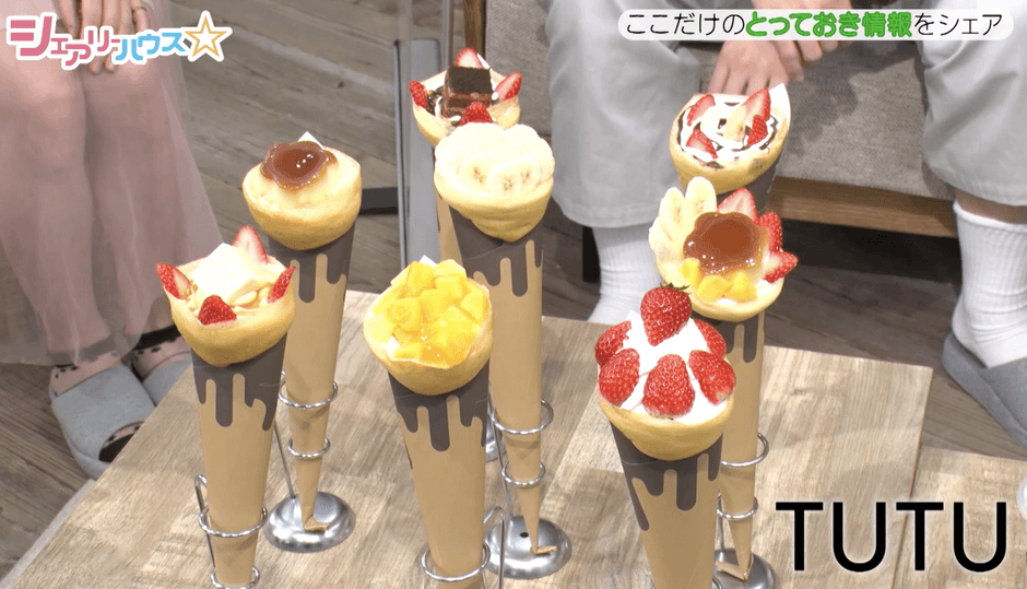 生イチゴやバナナ、プリンやショコラなど、見た目も華やかな「TUTU」クレープの登場で、出演者たちも思わず笑顔に。