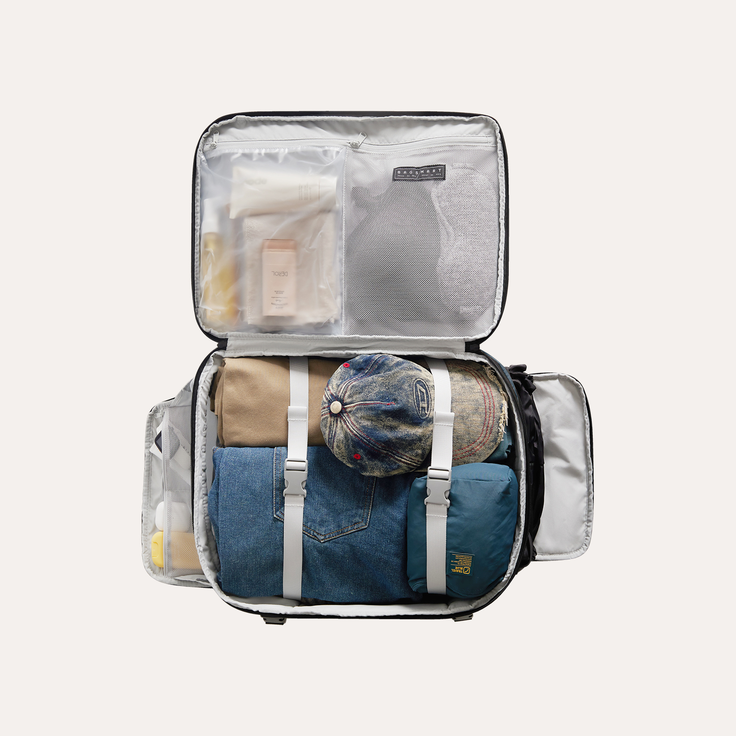 デッドスペース・ゼロ設計:四角いフォルムを維持し、PCから衣類までを隙間なく、かつシワを抑えて収納。