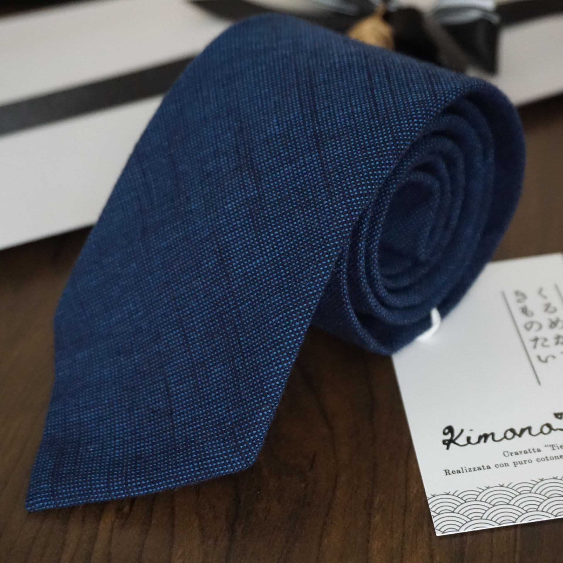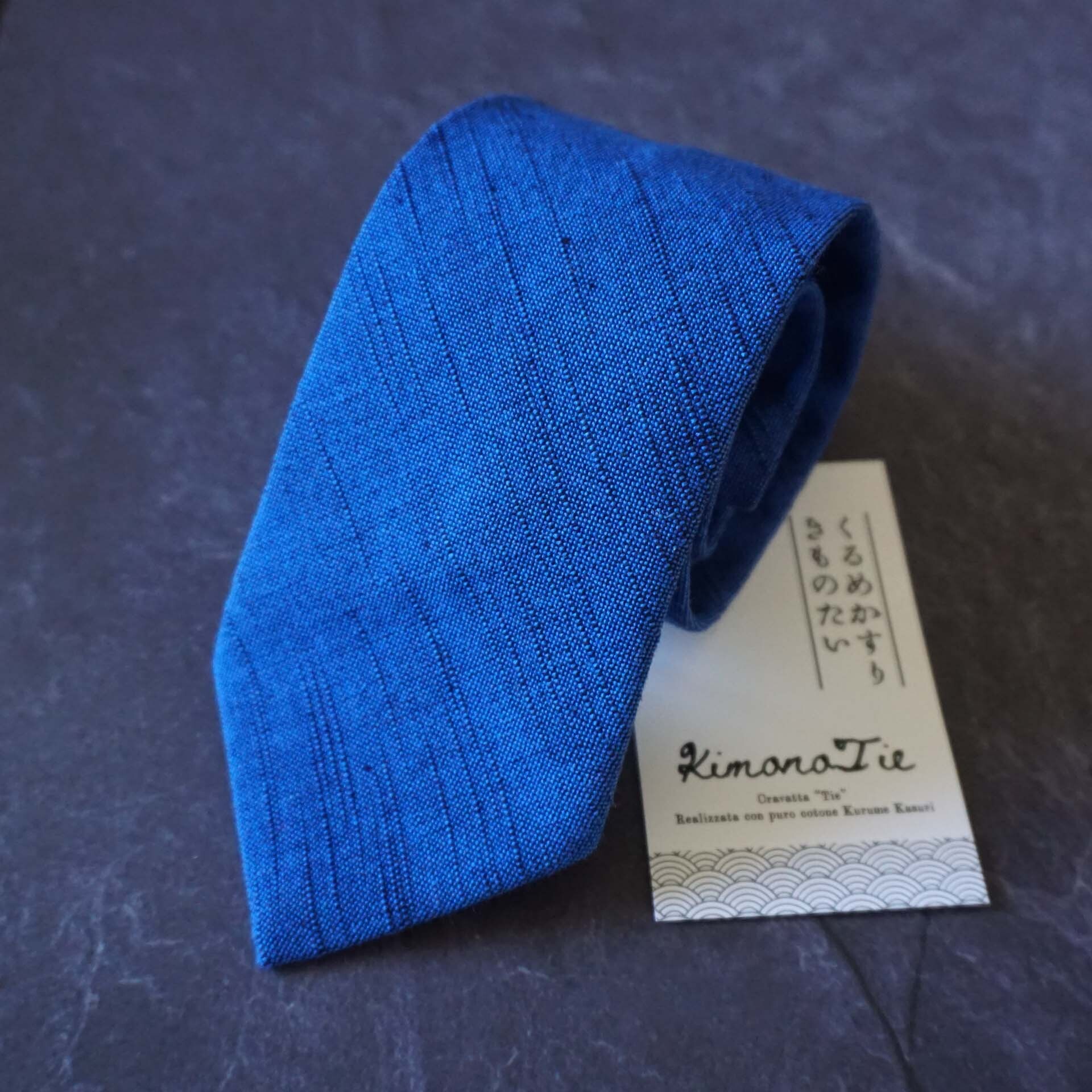 Kimonissimoでは、30以上の工程を経て完成までに2~3か月を要す久留米絣の反物の中でも、ビジネススーツやカジュアルなオフィスでのコーディネイトに合わせやすい、久留米絣の定番である藍色やネイビー系を中心に、無地や縞、そして伝統的な柄の「文人絣」(書生絣)などからセレクトし、ネクタイにお仕立て。縫製は、百貨店や有名ブランドのネクタイ縫製を手掛けるネクタイ専門の工房が手掛けています。
