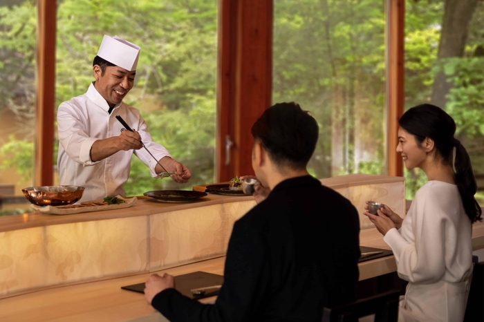 星のや軽井沢の敷地内にある戸建ての会場を一棟貸し切りにし、この日の一組のためのカウンター席を設けます。窓外の夕暮れから夜へと移ろう情景を眺めながら、周囲を気にすることなく、ゆっくりと食事の時間を楽しむことができます。また、料理人から山菜や川魚などの素材や仕立てのこだわりについての説明を聞き、目の前で揚げられてく臨場感とともに天婦羅を味わうことで、食体験が一層奥深いものになります。