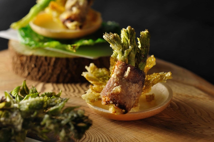 ほのかな香りともっちりとした食感が特徴で、「山菜の王様」ともいわれるタラの芽は、春の若芽を食べて旨味が凝縮した鹿肉を巻いて天婦羅にします。噛みしめるほどに溢れ出る鹿肉の旨味と、タラの芽のほのかな香りと苦味が調和します。