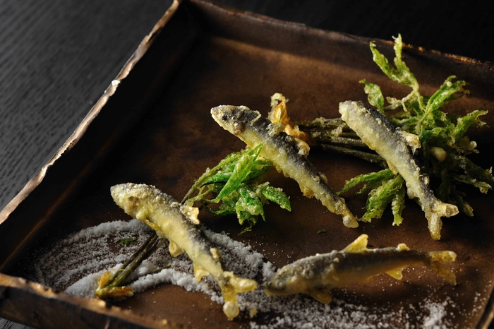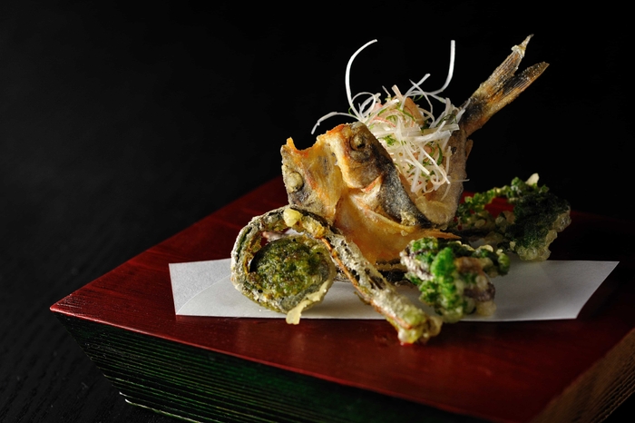 清流で育つウグイは臭みがなく、川の白身魚らしい淡白な味わいを楽しめるのが特徴です。このウグイには、香り高い行者ニンニクや苦味と酸味が楽しめるヤマブドウの若葉の天婦羅を添えて、春山の爽やかな香りを演出します。