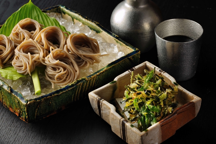 締めの食事では、香り高い蕎麦をノビルやコゴミ、ウルイなどの山菜のかき揚げを添えて提供します。蕎麦の実を昔ながらの石臼で挽いた蕎麦粉を使った八割蕎麦は香り高く、シコシコとした独特の食感が特徴です。