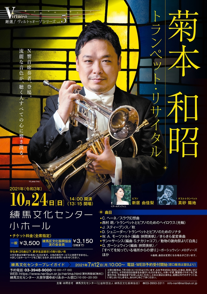 練馬文化センターは、NHK交響楽団首席トランペット奏者菊本和昭による、都内初の本格リサイタル「厳選!ヴィルトゥオーゾシリーズvol.5 菊本和昭トランペット・リサイタル」を2021年10月24日(日)に開催します。