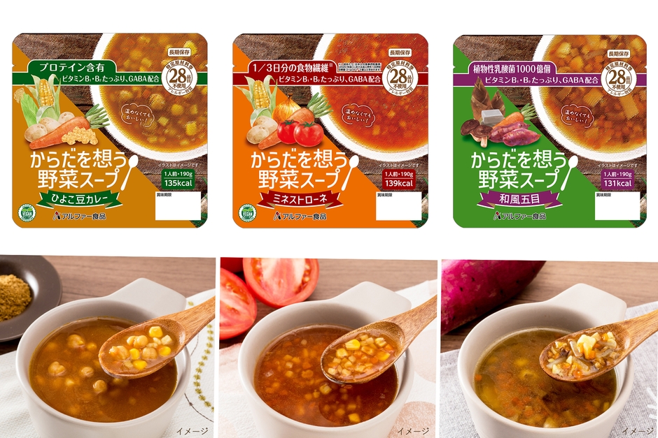 アルファ化米を主軸に加工米飯の製造・販売を行っている、アルファー食品株式会社(本社:島根県出雲市、代表取締役:林 隆史)は、特定原材料等(アレルギー物質)28品目不使用で、温めずにそのまま食べられる長期保存食『からだを想う野菜スープ』シリーズの販売を開始いたします。普段の生活だけでなく、避難時に不足しがちな栄養素や、健康問題を軽減する成分をプラスした「ひよこ豆カレー」・「ミネストローネ」・「和風五目」の3品をラインアップ。