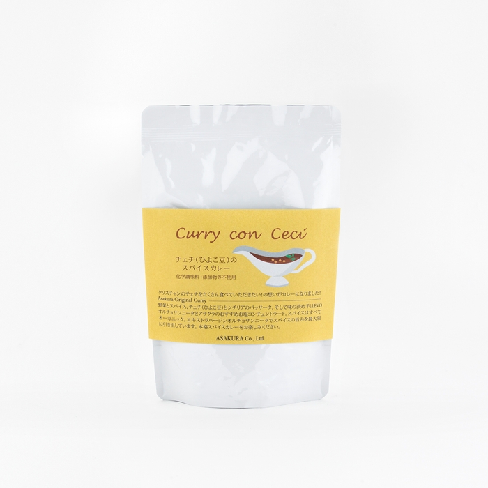 たまねぎ(国産)、トマトピューレー、じゃやがいも、ひよこ豆、エキストラバージンオリーブオイル、カレー粉、にんにく、食塩、スパイス