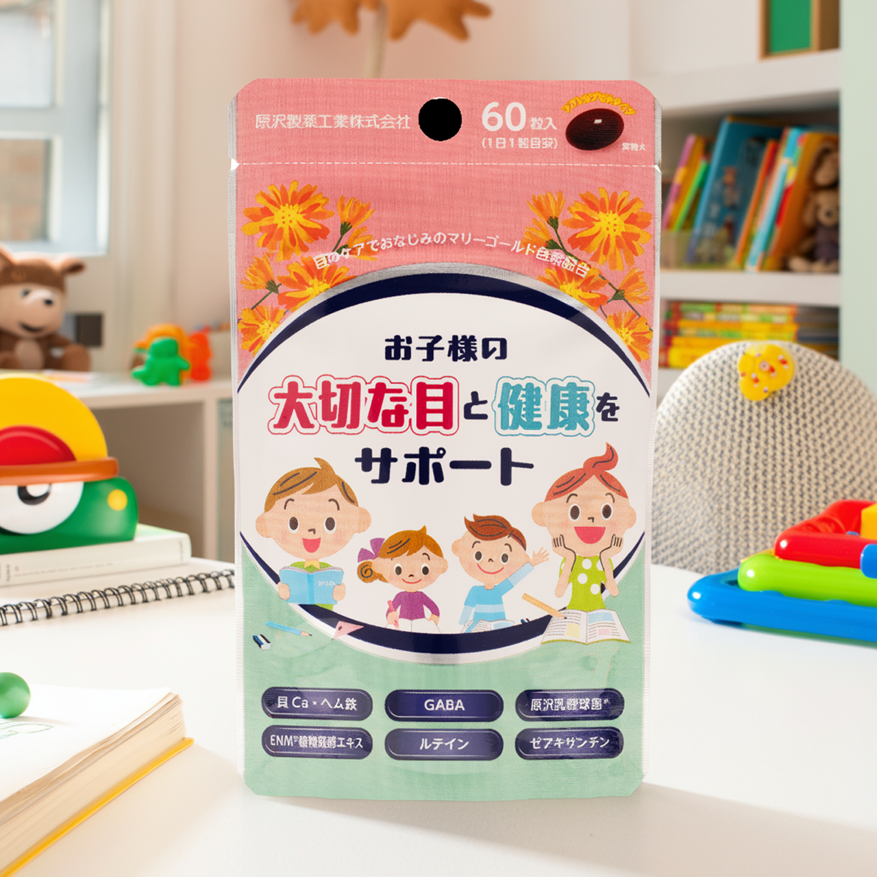 本製品は、デジタル社会で成長する子供たちの健やかな毎日をサポートするために、子供を持つ社員の声から開発されたサプリメントです。