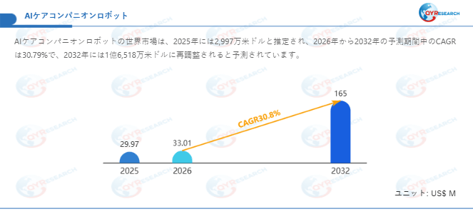 QYResearch調査チームの最新レポート「AIケアコンパニオンロボット―グローバル市場シェアとランキング、全体の売上と需要予測、2026~2032」によると、AIケアコンパニオンロボットの世界市場は、2025年に29.97百万米ドルと推定され、2026年には33.01百万米ドルに達すると予測されています。その後、2026年から2032年にかけて年平均成長率(CAGR)30.8%で推移し、2032年には165百万米ドルに拡大すると見込まれています。