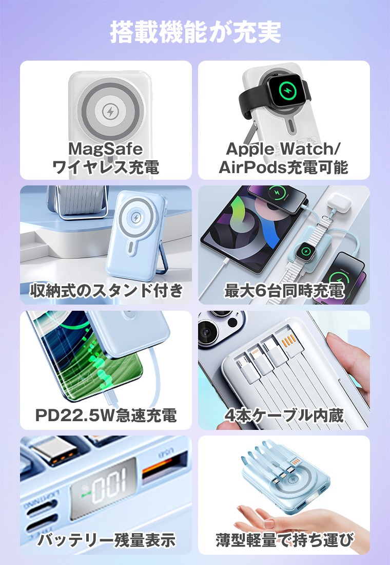 4本ケーブル内蔵・MagSafe対応。Apple Watch&AirPods Proも充電でき、スタンド機能付きで動画視聴や作業も快適。