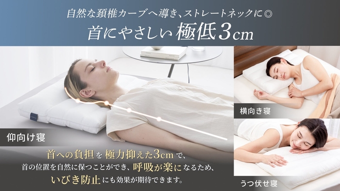 【極低3cmの枕で首・肩ラクに。呼吸もスムーズ】
