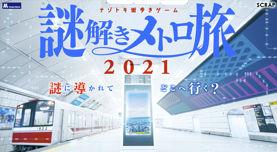 株式会社 SCRAP(所在地:東京都渋谷区、代表者:加藤隆生)は、Osaka Metroと共催し、周遊型リアル脱出ゲーム「ナゾトキ街歩きゲーム『謎解きメトロ旅2021』」を2021年10月28日(木)~2022年5月31日(火)の期間に開催いたします。
