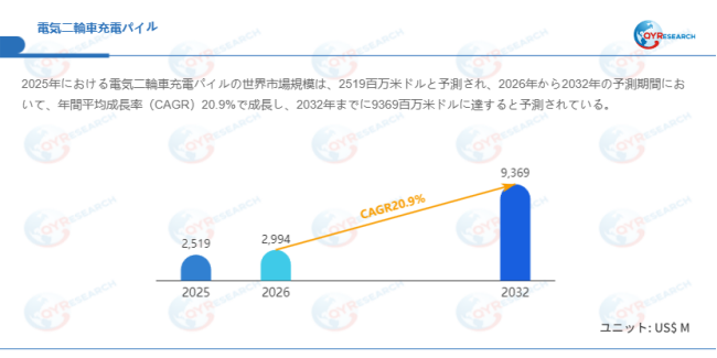 QYResearchが発表した新たな市場調査レポート「電気二輪車充電パイル―グローバル市場シェアとランキング、全体の売上と需要予測、2026~2032」によると、世界の電気二輪車充電パイル市場規模は2025年の約2519百万米ドルから2026年の2994百万米ドルへと順調に拡大すると見込まれ、予測期間中は年平均成長率(CAGR)20.9%で成長し、2032年には9369百万米ドルに達すると予測されている。