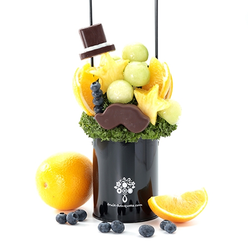 キュートなハットとポップな口ひげのアレンジメントは、どこにもない、プレジールのフルーツブーケオリジナルデザイン。