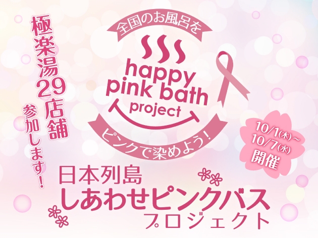株式会社極楽湯(本社:東京都千代田区、代表取締役社長:新川 隆丈)は、ピンクリボン月間にあわせて行われる「日本列島しあわせピンクバスプロジェクト」への参加が決定しました。2020年10月1日(木)~10月7日(水)の期間、直営29店舗でお風呂イベント「しあわせピンクリボンの湯」を開催します。