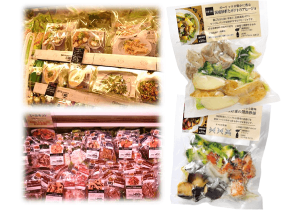 材料・調味料がすべてそろっている便利なミールキット商品。農産売り場には八百屋さんのミールキットコーナー、畜産売り場にはこだわりの“あまに豚・あまに鶏”を使用した商品、冷凍食品売り場にはBIO-RALのミールキットをご用意いたします。