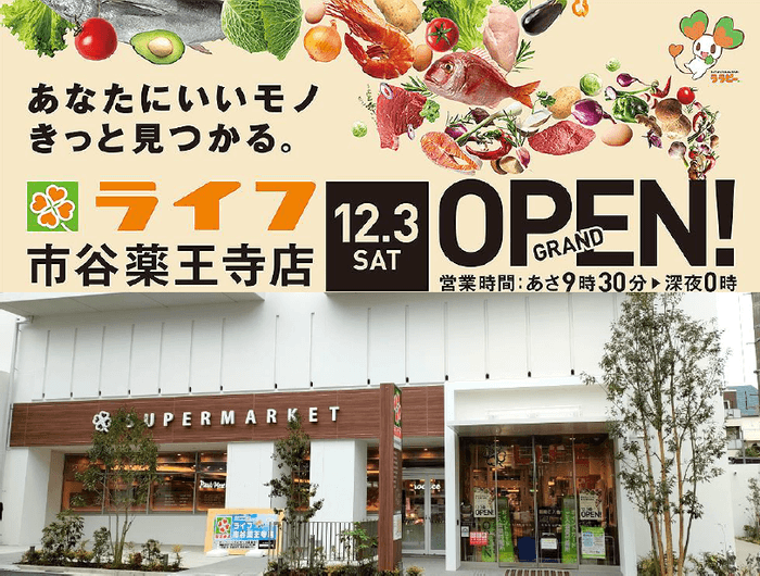 “おいしい” “ワクワク” “ハッピー” をお届けするライフコーポレーションは、「ライフ市谷薬王寺店」を12月3日(土)にグランドオープンいたします。