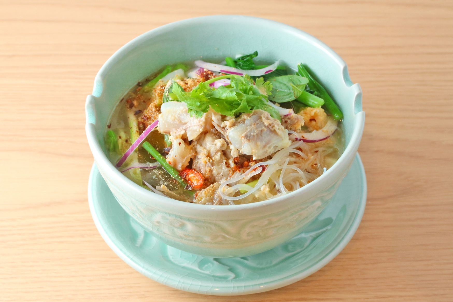タイ東北地方の郷土料理である“チムチュム”は、レモングラスやバイマックルー、唐辛子、カー、ホラパーなどのハーブを炊き込み作る、香り豊かなハーブスープです。チムチュムの酸味が、平田牧場の三元豚が持つ脂の甘さを更に引き立て、一口食べると、豊かな旨味とハーブの清涼感が口いっぱいに広がります。