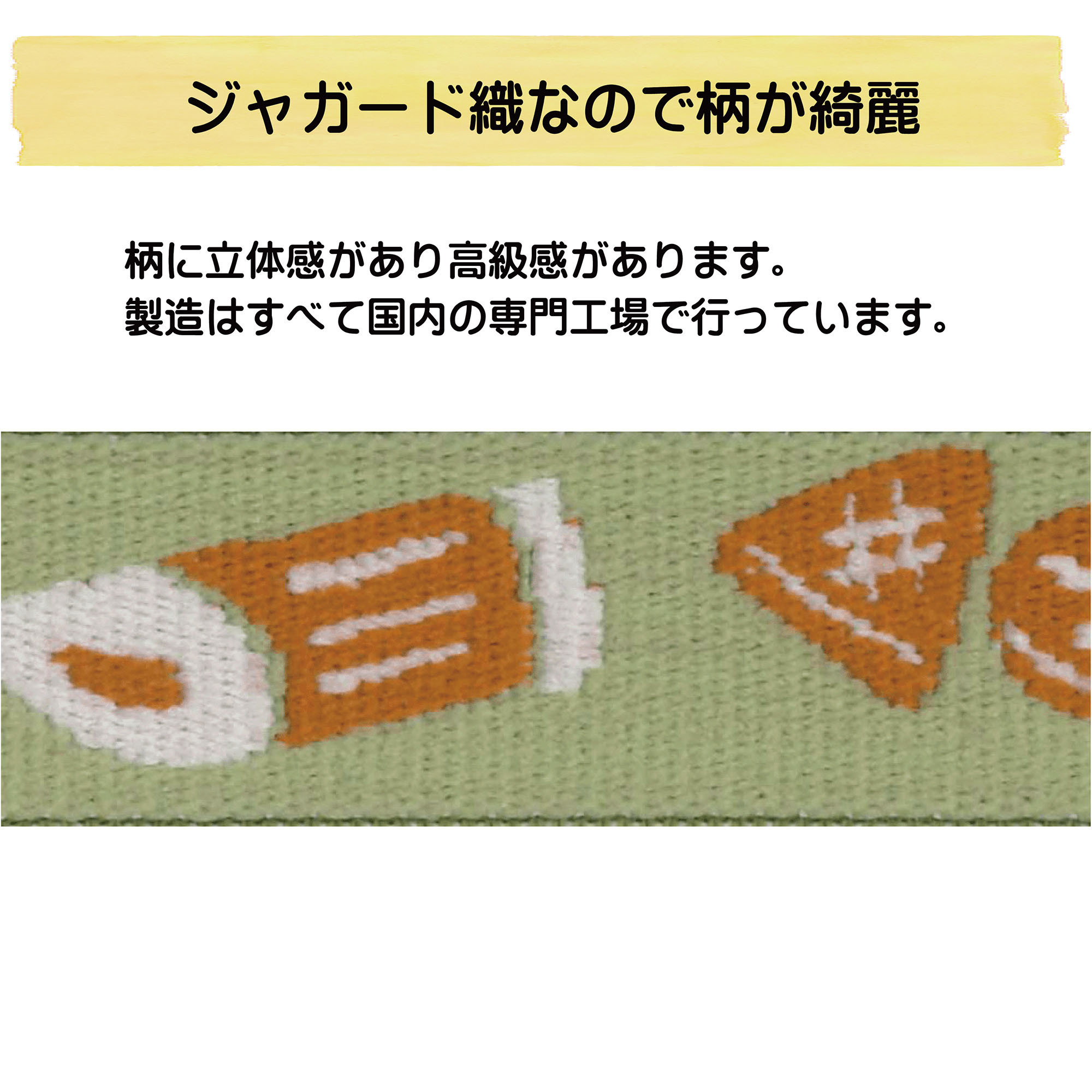 市場調査を行う中で浮かび上がったのは、「かわいいデザインが少ない」「すぐに伸びてしまう」というランチベルトへの不満の声でした。約1年の開発期間を経て、たどり着いたのが“ジャガード織による高級感と、糸ゴムメーカーならではの耐久性”を両立した製品です。