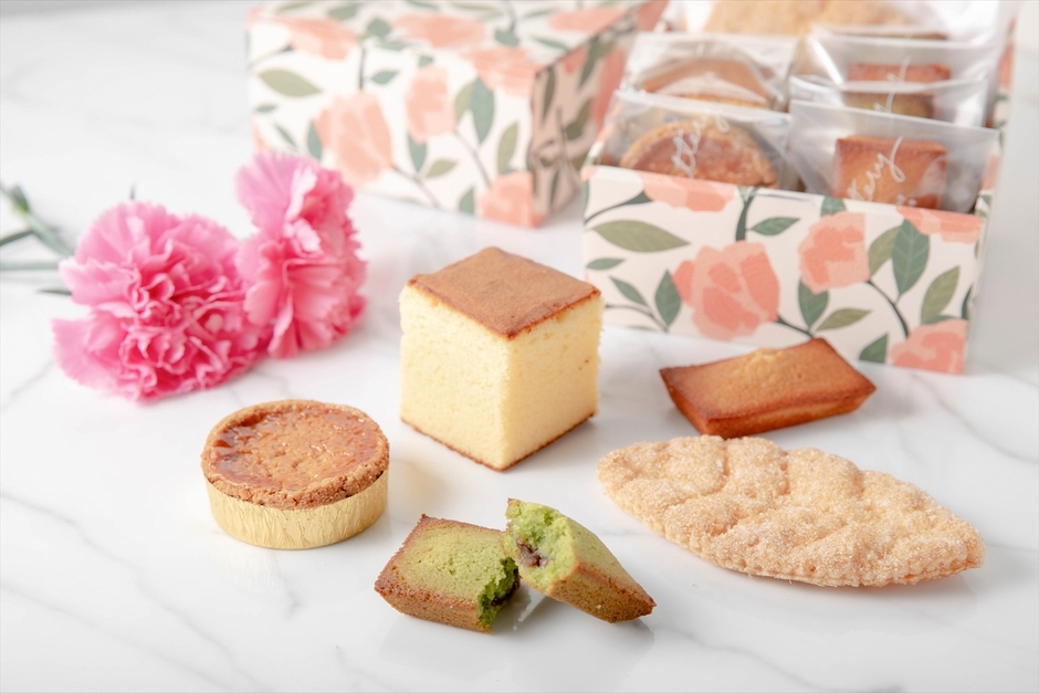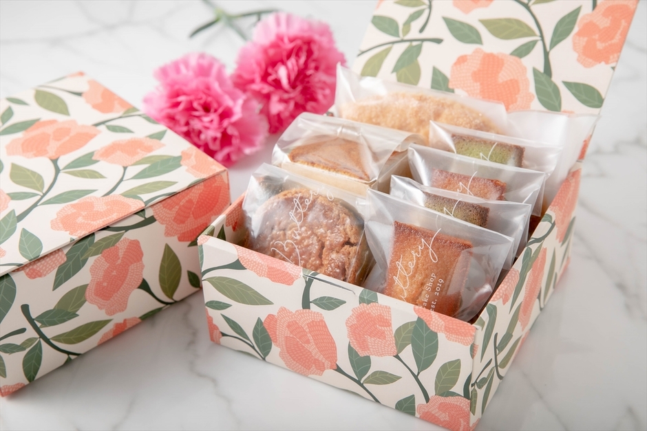 店頭・オンラインにて販売する「母の日ギフトアソート」は、カーネーション模様のギフトボックスが華やかな、期間限定商品。濃厚な西尾の抹茶と北海道バターを使用した「抹茶フィナンシェ」には、北海道十勝産の小豆を加えて、上品な味わいに仕上げました。また、Butteryの看板商品でフランス産発酵バターをたっぷりと使ったコクのある「フィナンシェ」や、国産発酵バターの香りとはちみつの優しい甘さが特徴の「バタリーカステラ」、ザクザクとした食感がたまらない「ガレットブルトンヌ」「リーフパイ」をアソート。このギフトボックスでしか味わうことのできない、期間限定のラインナップとなっています。