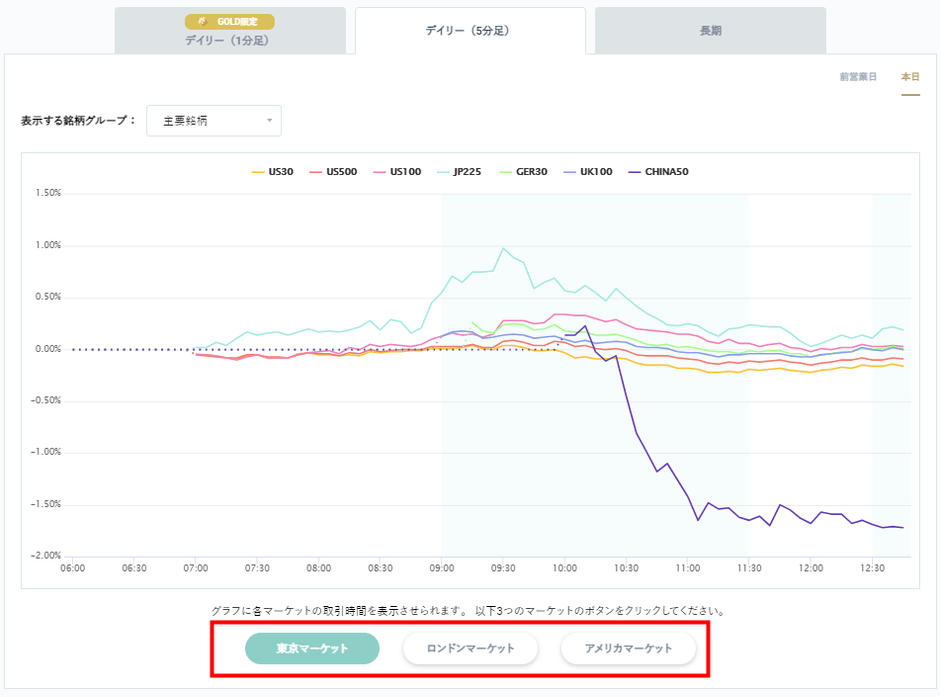 グラフの下にある「東京マーケット」「ロンドンマーケット」「アメリカマーケット」をクリックすると、各マーケットのオープン時間をグラフ上にレイヤーで重ねて表示させられるようになりました。