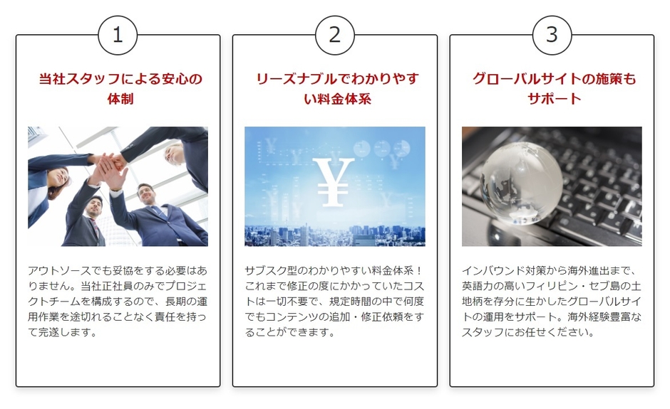 実施拠点となる「セブITアウトソーシングセンター」は、フィリピン セブ島に存在し、設立から10年以上を経過しているため、圧倒的に低い離職率を誇る自社オフショア拠点です。フィリピンは公用語が英語であるため、グローバル対応が求められる多言語Webサイトの運用保守や、海外に本社があり、英語でのコミュニケーションが求められる外資企業様のWebサイトの運用保守も問題ありません。