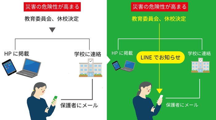 教育委員会からの休校情報はメール・HP等で発信をしていますが、メールの場合は、学校を経由してから保護者に届くので、学校の営業時間終了後に急な災害が発生した際にタイムリーに情報を保護者に届けられない点や、保護者のメールの見落とし・情報確認の遅れも課題となっていました。