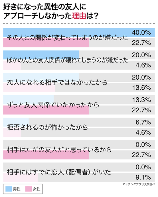 次に「なぜ好きになった異性の友人に対してアプローチしないのか」についてのアンケート結果を、男女別に見ていきましょう。