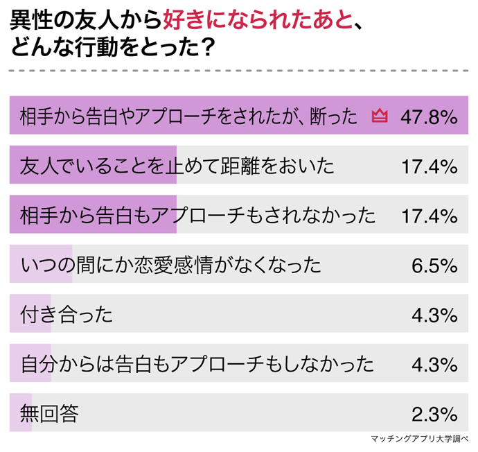 異性の友人から好きになられた場合はどうでしょうか。もっとも多かった行動は「相手から告白やアプローチをされたが、断った」が47.8%、次が「友人でいることを止めて距離をおいた」「相手から告白もアプローチもされなかった」で同率17.4%でした。