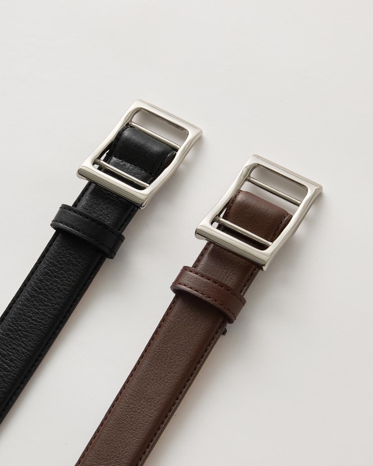 一見すると、シンプルなレザーベルト。実はその裏側にはスマートな「スライドバックル」が隠されています。一般的なベルトのように2〜3cm間隔の位置で合わせるのではなく、ピンホール(ベルト穴)を完全になくしたことで自分にぴったりのサイズにアジャストできます。機能を追求した結果、このミニマルなデザインに辿り着きました。