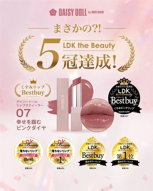 株式会社クラブコスメチックス(本社・大阪市 代表取締役社長:中山ユカリ)はDAISY DOLL by MARY QUANTから展開する『デイジードール リップ スティーラー 07 幸せを掴むピンクダイヤ』が、コスメを本音で評価する人気美容誌「LDK the Beauty」(株式会社晋遊舎)2025年10月号において「くすみピンクリップ部門」ベストバイを受賞いたしました。
