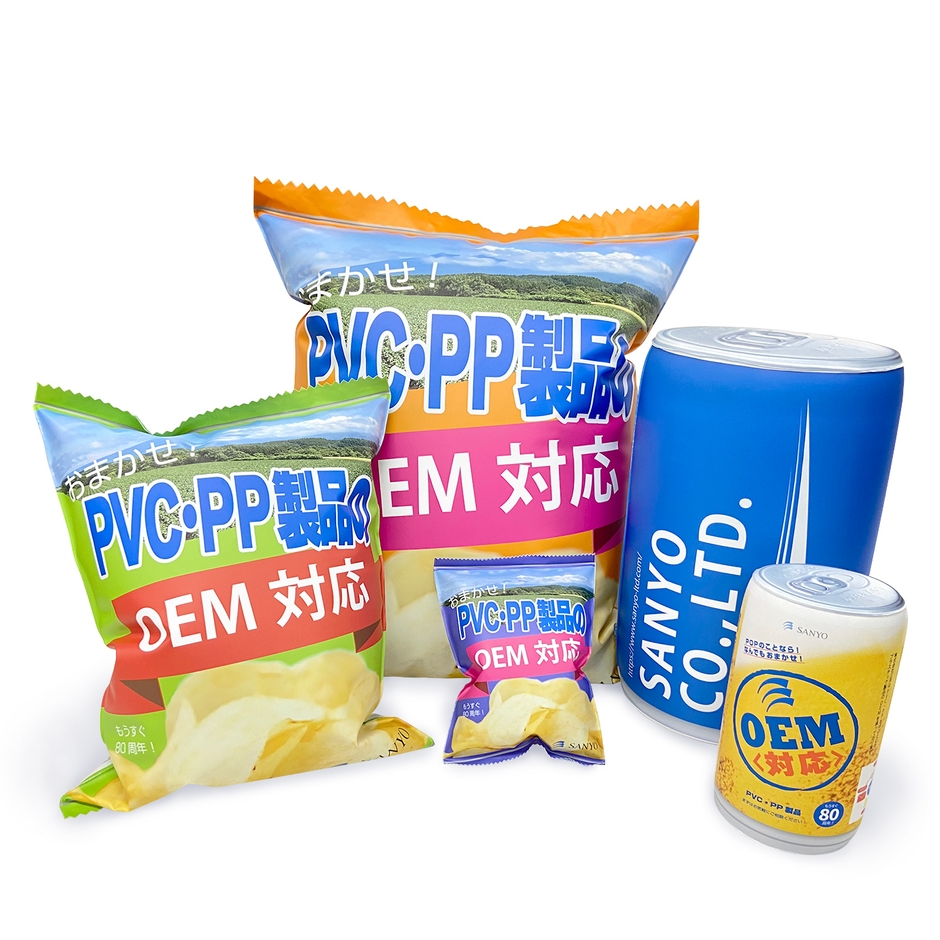 販促用の空気入りビニールは店頭POPとして利用されることが多く、その中でも「ダミーPOP」は商品を模して制作されます。様々な形やサイズに対応することができ、商品そのままの見た目で大きく制作することが可能なので、商品の形状を印象に残しやすい特徴があります。軽量のため、高いところに吊るすことが可能で、店内でも売り場が遠くからでもわかりやすくなるため主に食品業界に人気です。また乗物など大きなものを小さなPOPにする事例もあります。