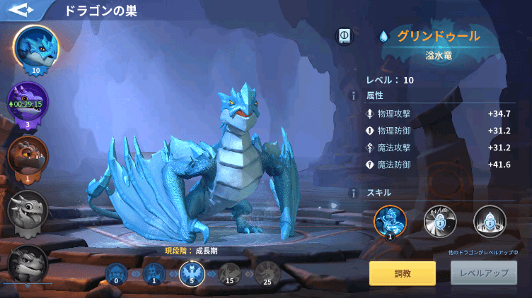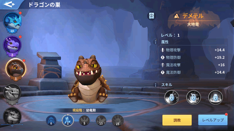 ドラゴンはそれぞれ水、土、雷と、固有の属性を持っており、部隊編成時には、部隊の属性バフを上昇させる効果を持っています。ドラゴンが所持するスキルも、回復、スタン、ダメージ、と様々であり、素材を使った調教を行うことで、そのスキル効果を上昇させることができます。