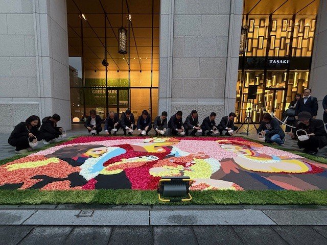 御堂筋インフィオラータは、花を通じて人と街をつなぐ市民参加型のアートプロジェクトです。制作には地域の学生や企業ボランティア、市民グループなど120名が参加し、花を通じて笑顔と交流が広がりました。
