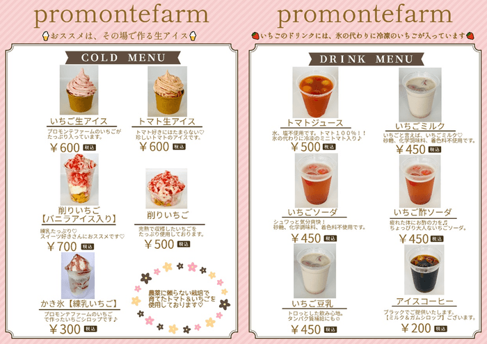 プロモンテファームで健康に育てたトマトといちごをつかった「生アイス」は素材の旨味を活かすためその場でつくります。保存料や着色料はもちろん、安定剤や乳化剤も使用していないので、よりカラダにやさしいおいしい生アイスに仕上がりました。