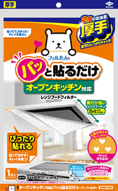 そこで、オープンキッチンに多い大き目の換気扇にも対応可能な「オープンキッチン対応 パッと貼るだけスーパーフィルター 整流板付専用」として発売いたしました。