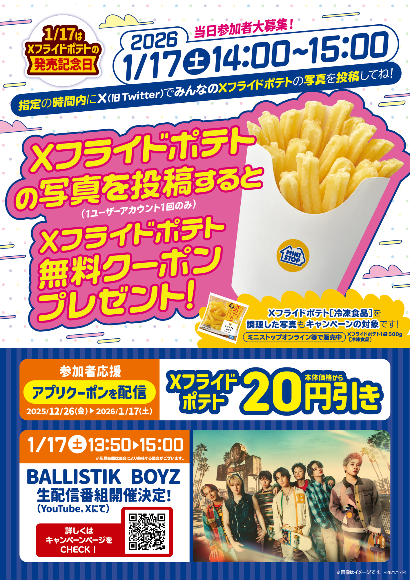 ミニストップは、7人組ダンス&ボーカルグループ「BALLISTIK BOYZ (バリスティック ボーイズ)」とのコラボレーション企画第2弾を実施します!人気の「Xフライドポテト」は、2026年1月17日(土)で、発売から23年目を迎えます。発売記念日に