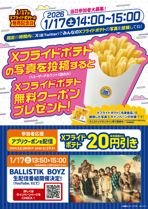 「#バリとXポテ活」と「@ministopfan」をつけて、Xフライドポテトの写真を投稿し、「BALLISTIK BOYZ」の皆さんと生配信番組をお楽しみください。
