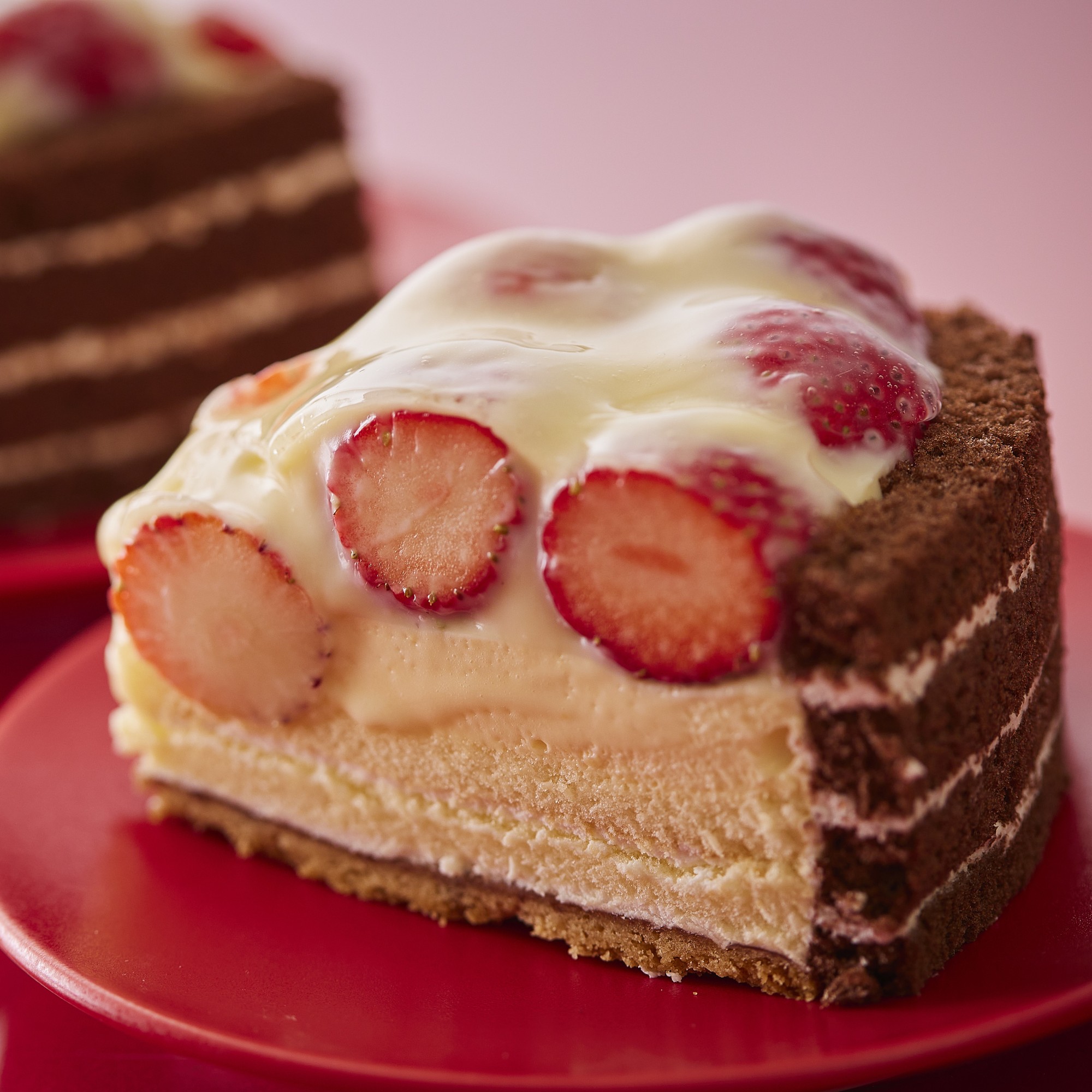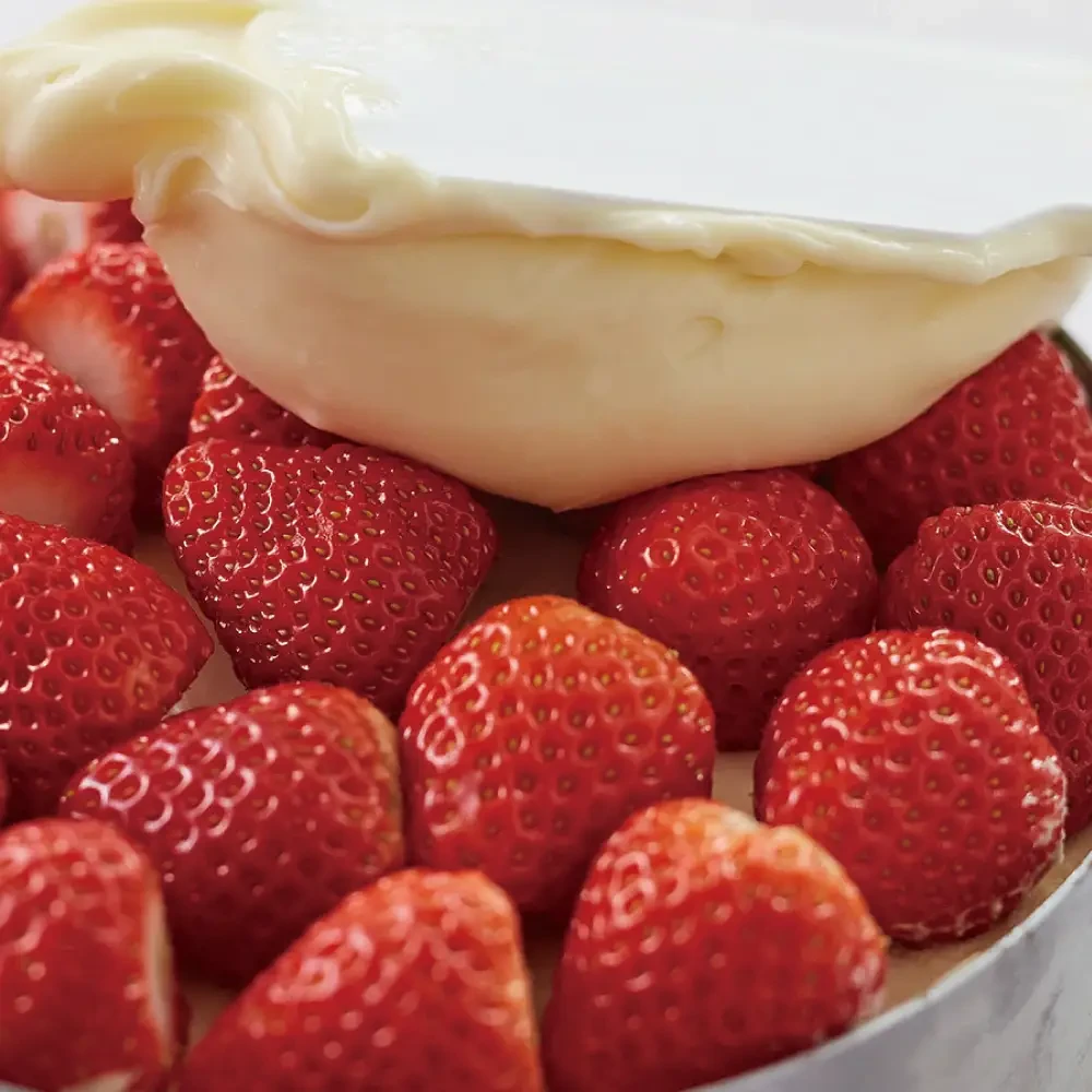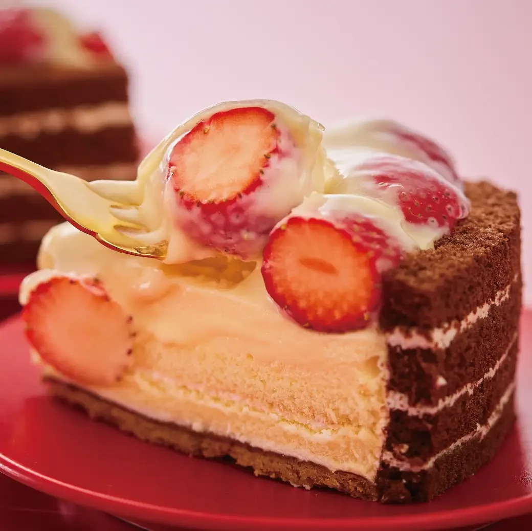 甘みと酸味のバランスが絶妙なイチゴを贅沢に敷き詰め、なめらかな特製カスタードクリーム、とろけるババロア、ふんわりスポンジ生地、香ばしいクッキー生地、そしてコク深いココアスポンジが織りなすハーモニー。