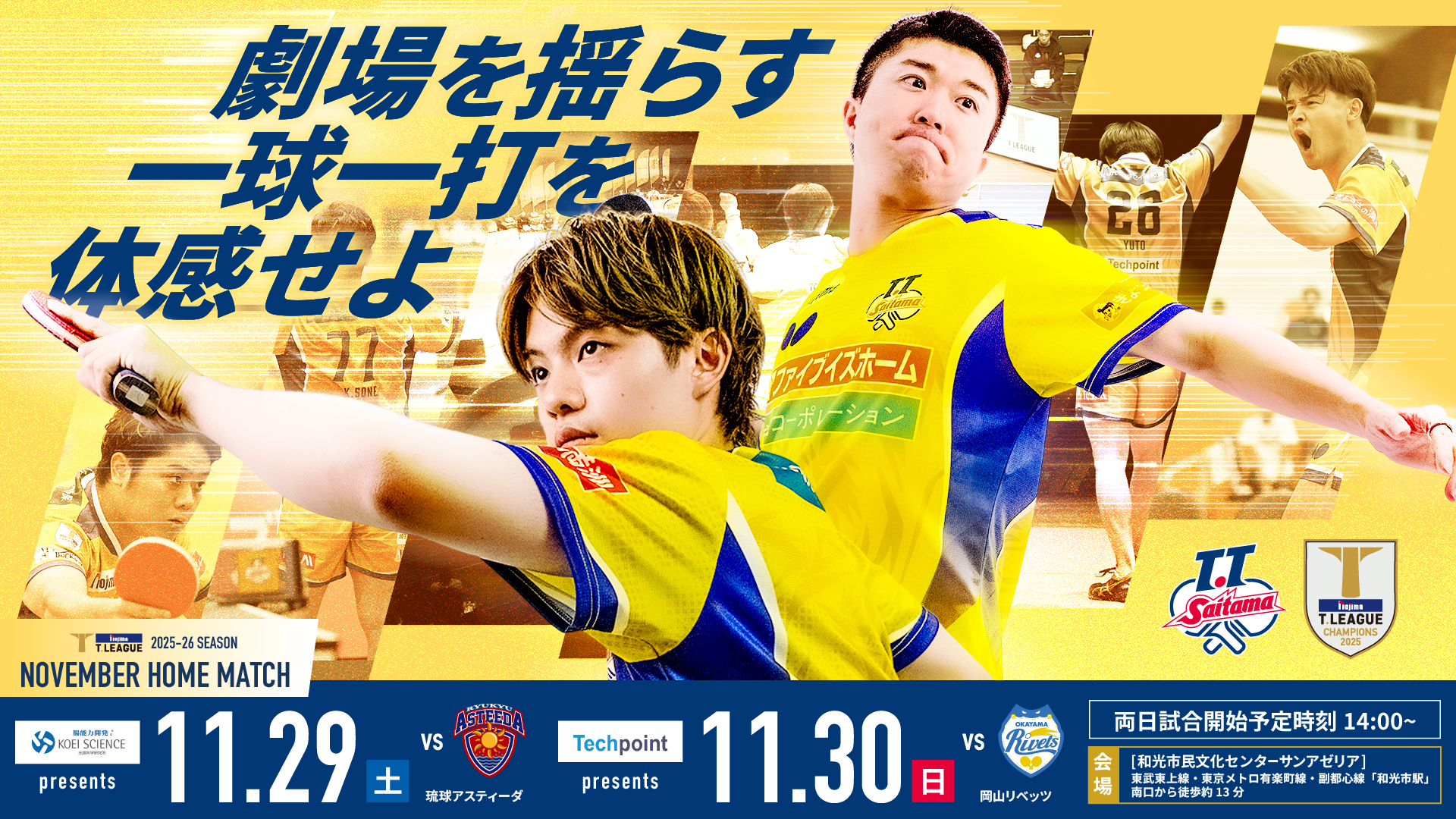 『光英科学研究所プレゼンツ T.T彩たまホームマッチ』 劇場型卓球を和光市で体験!11月29日抽選で100名様を無料ご招待