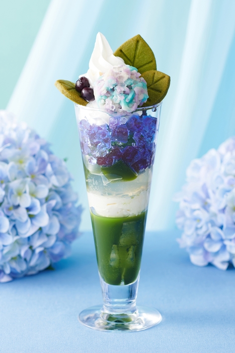紫陽花パフェのセットメニューとして、もっちりしたういろう生地に宇治抹茶を練り込み、小豆をのせて蒸し上げた、爽やかに宇治抹茶が香る新作「お抹茶の水無月」を添えた「紫陽花茶会」が登場いたします。2024年6月中旬~6月下旬限定で提供予定です。