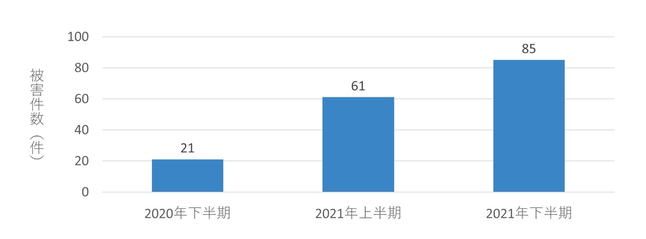 警察庁によれば、2021年中における国内の被害件数は146件(2021年上半期61件、下半期85件)であり、2020年下半期(21件)以降、右肩上がりで増加しています。その被害は、企業・団体等の規模やその業種等を問わず、広範に及んでいます。