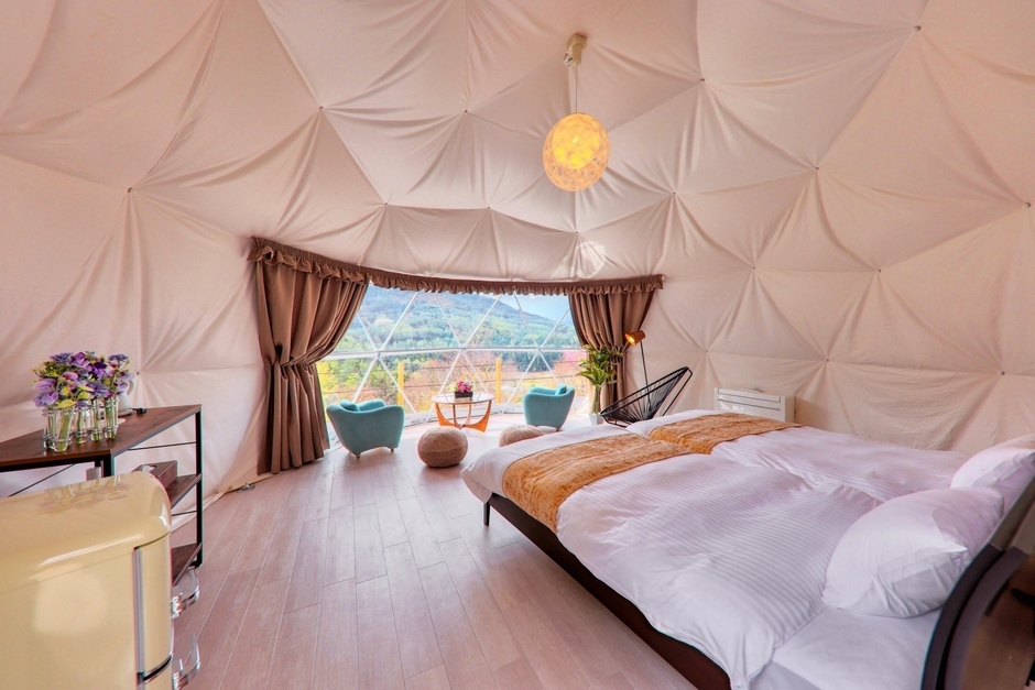 ・宿泊は「杓子山ゲートウェイキャンプ」の2022年に新設されたドームテント「グランスイート-ラグジュアリー」(最大4名様宿泊可)、「グランスイート-デラックス」(最大2名様宿泊可)からお選びいただけます。眺望抜群の新設の露天風呂「天空の湯」、現在建設中のアウトドアサウナがツアー貸切となります。
