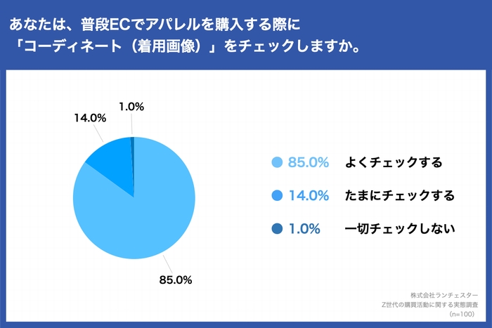 「普段ECでアパレルを購入する際に「コーディネート(着用画像)」をチェックしますか。」(n=100)と質問に対し、「よくチェックする」が85.0%、「たまにチェックする」が14.0%という結果となった。