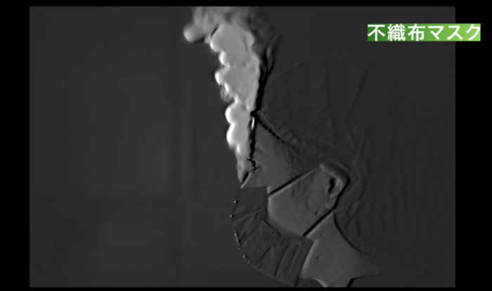 微粒子可視化システムにて、一般的な不織布マスクを着用し、呼気の流れを可視化。マスク未着用時は呼気が口からそのまま流れ出ていきます。マスクを着用すると上部のすき間から呼気が漏れ、肌を伝って目にかかることが確認できました。