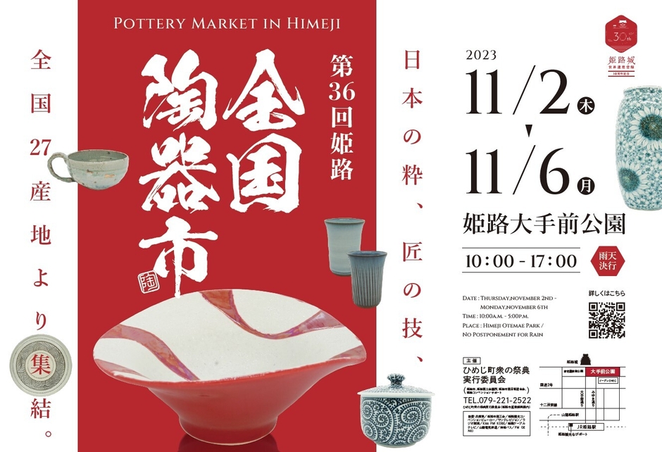 ひめじ町衆の祭典実行委員会は、全国のおよそ30の産地から集まった選りすぐりの陶器を展示販売する「第36回姫路全国陶器市」を、2023年11月2日(木)から11月6日(月)までの5日間開催します。