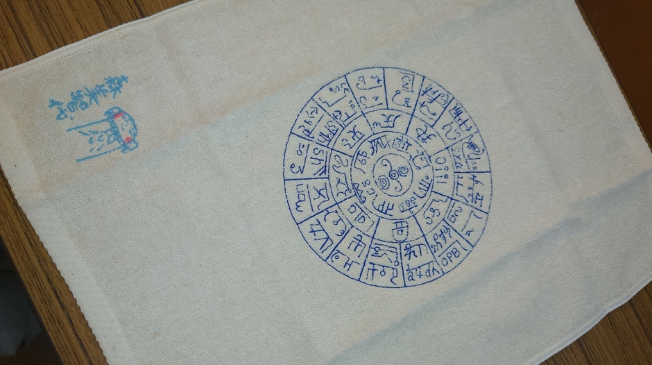 すでに、今治産の麻と綿のハンドタオルに龍体文字フトマニ図の刺繍、著者の森美智代先生のサイン・トレードマークであるお地蔵さんを施しグッズ化を推進しております。